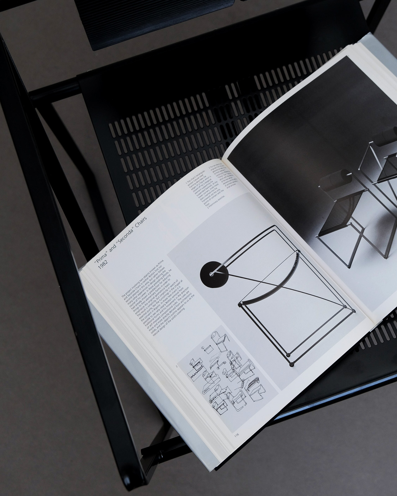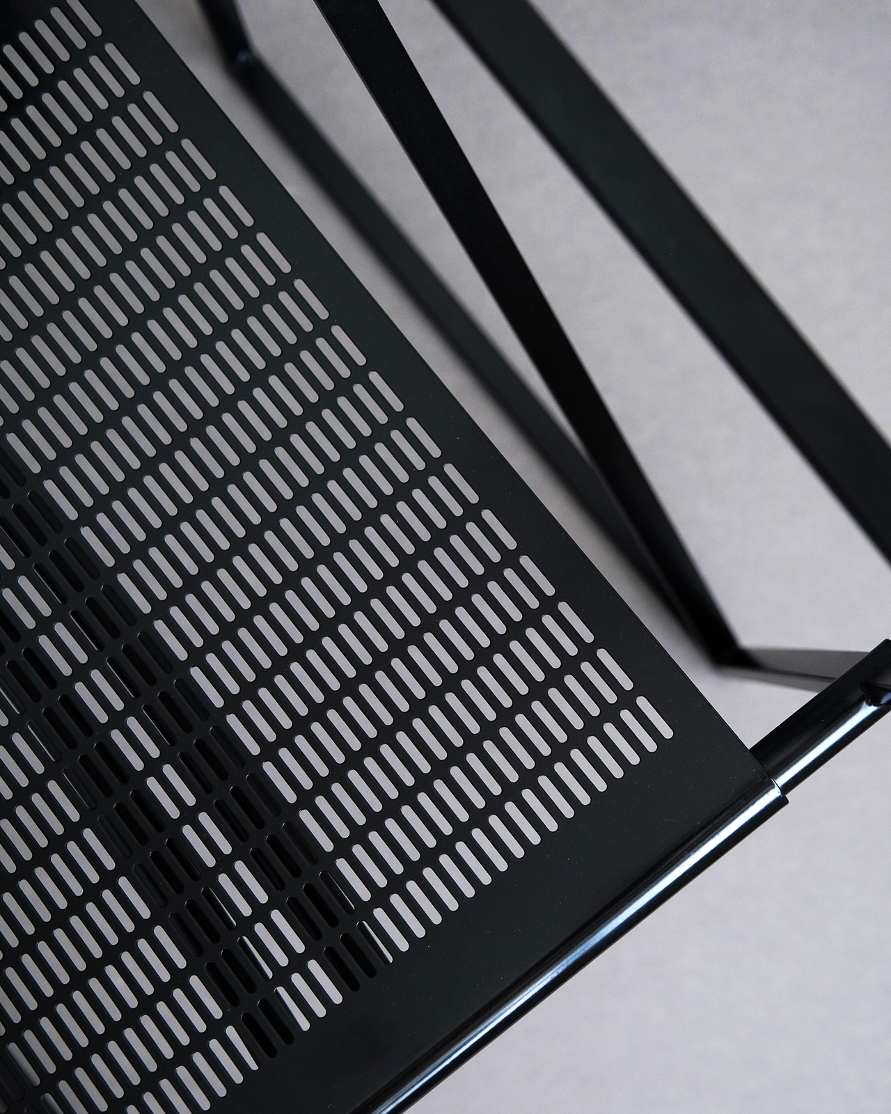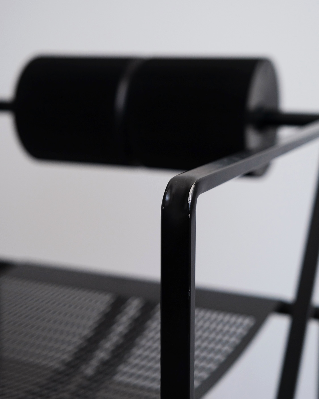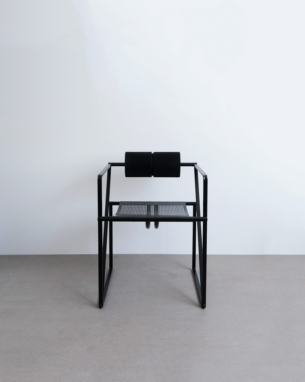 直線によって構成された繊細なフレームにパンチングメタルの座面、そしてシリンダー型のラバーの背もたれが、氏の幾何学的な建築作品に呼応するようなグラフィカルな一脚。