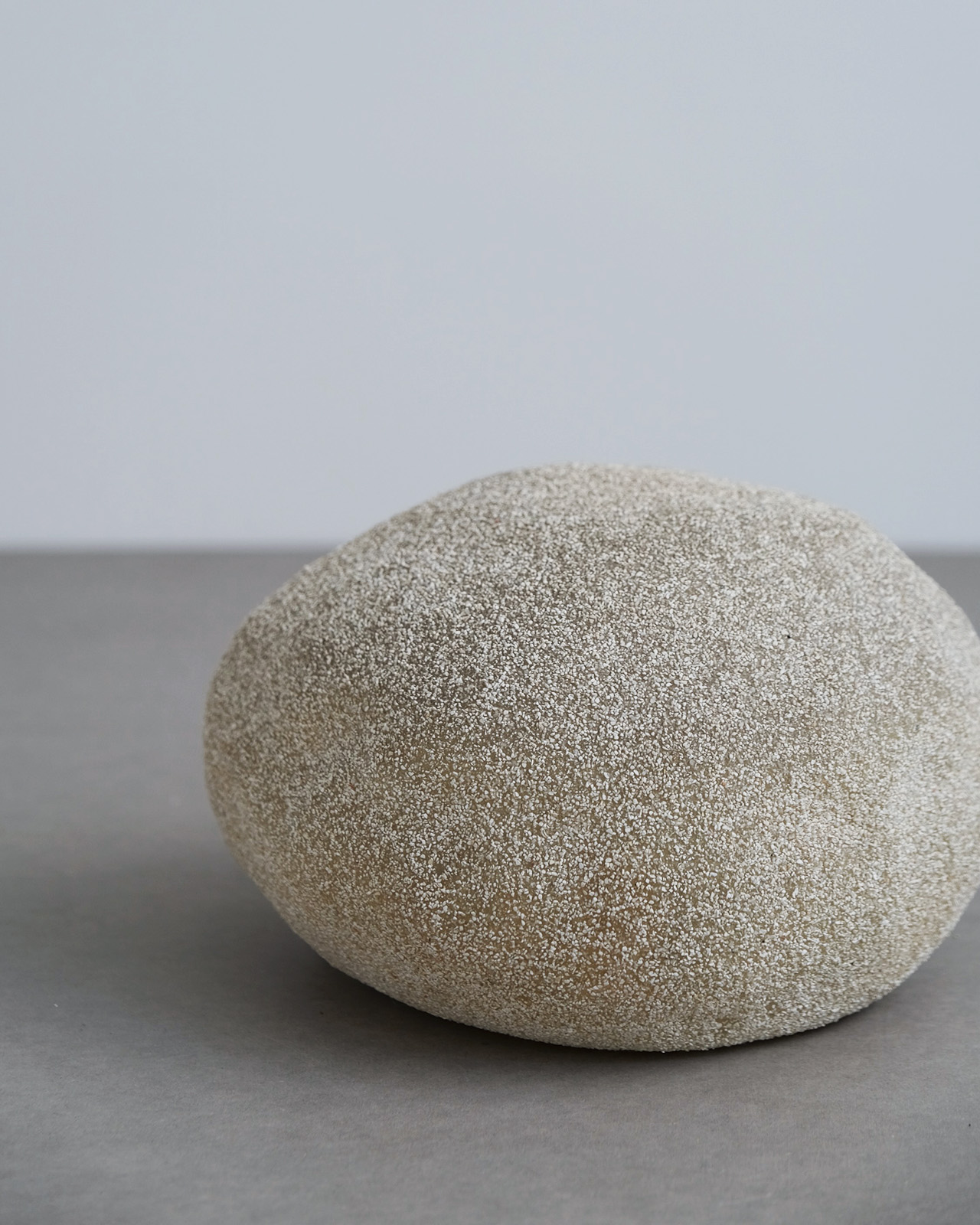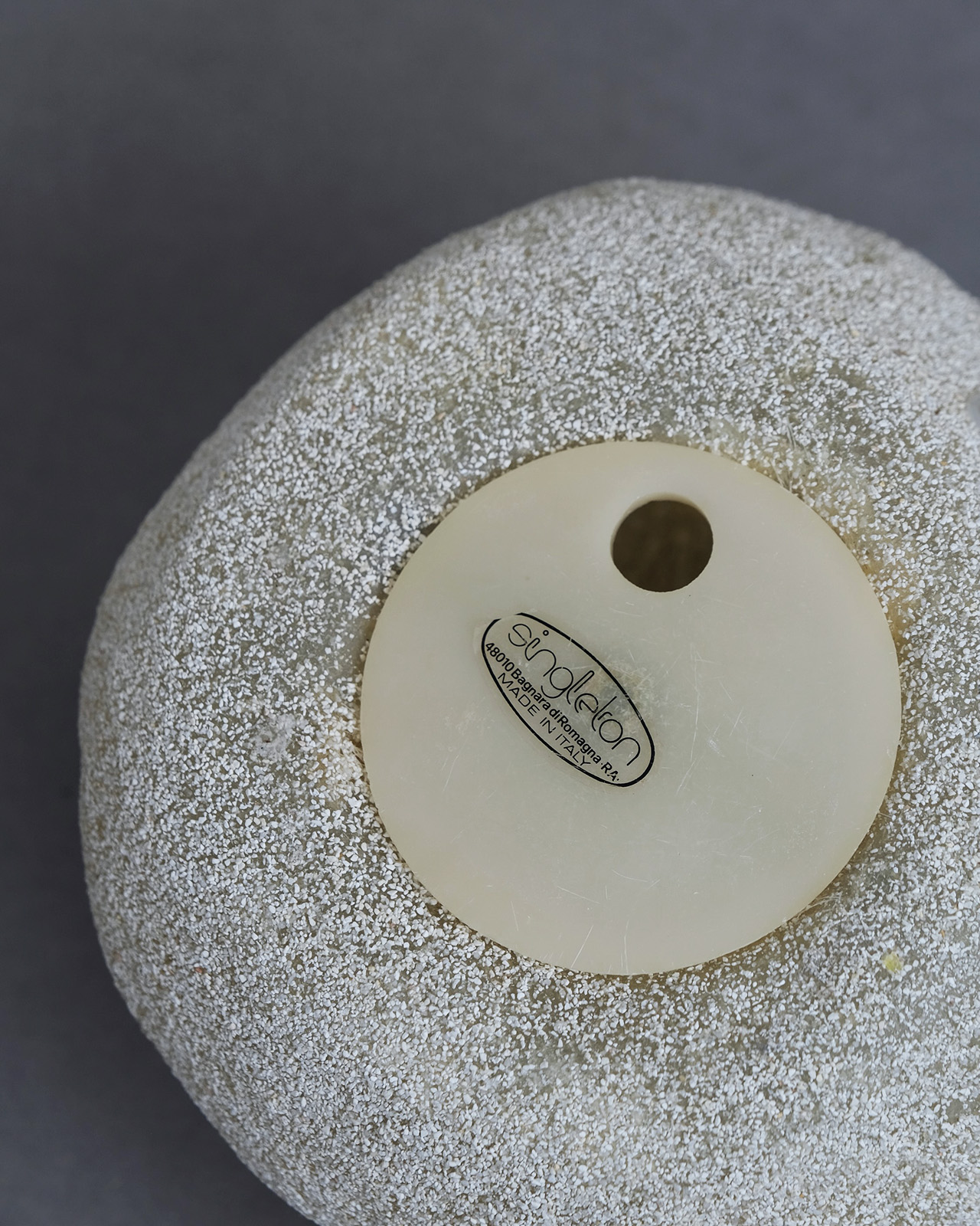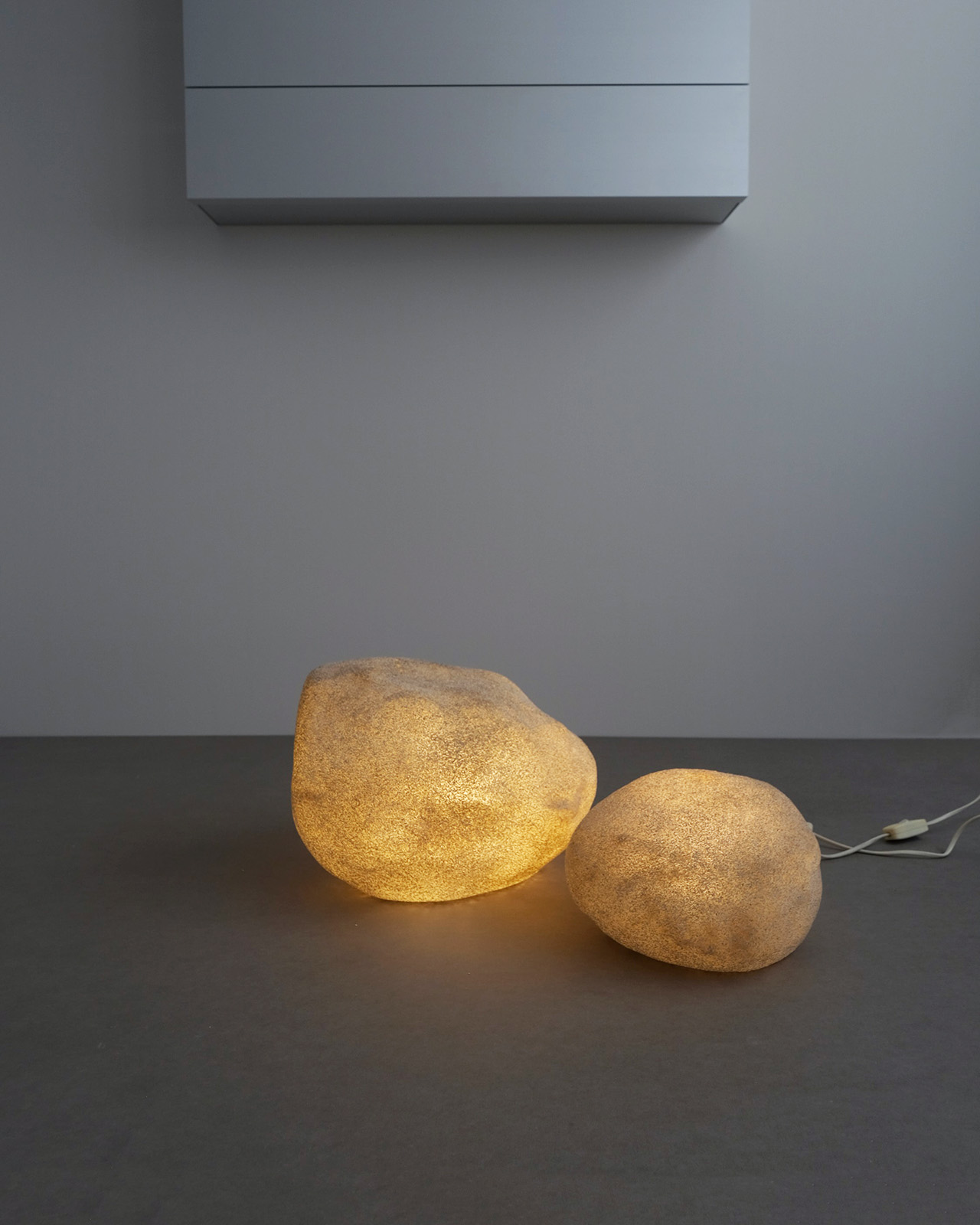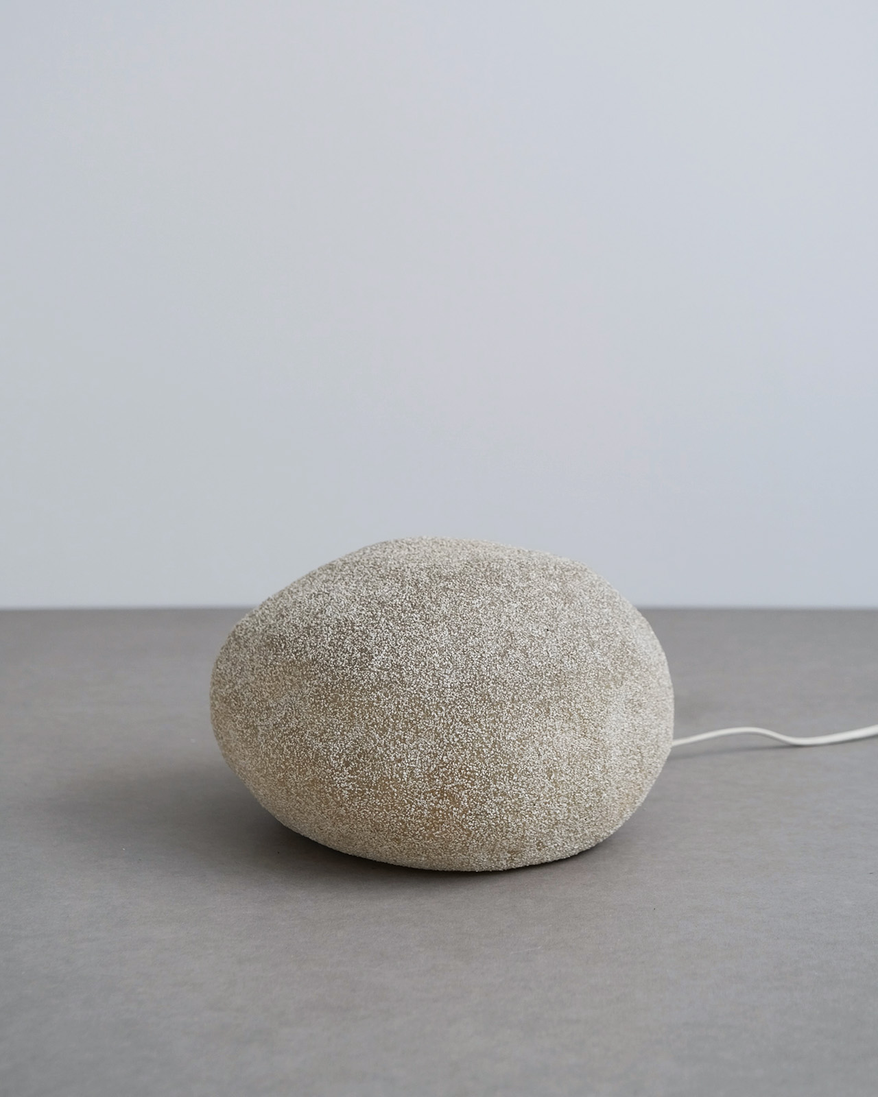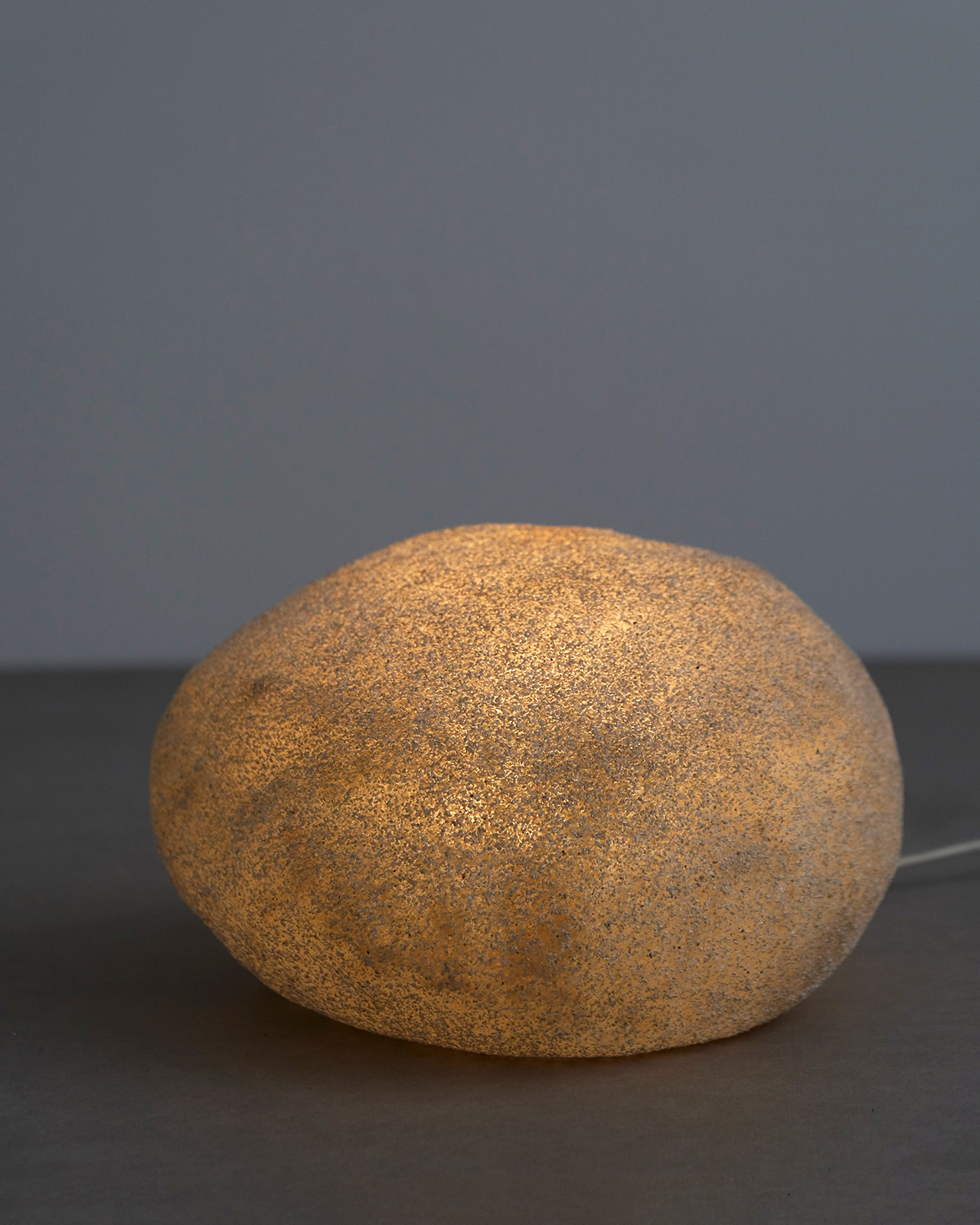 樹脂製の本体に粉状の大理石を吹き付け、まるで本物の岩のような質感を表現した独創的な照明。通称ムーンロックランプとも呼ばれるように、照明のオンオフによって大自然の中に佇む岩のようにも、夜空に美しく浮かぶ月のようにも見える神秘的なデザインです。