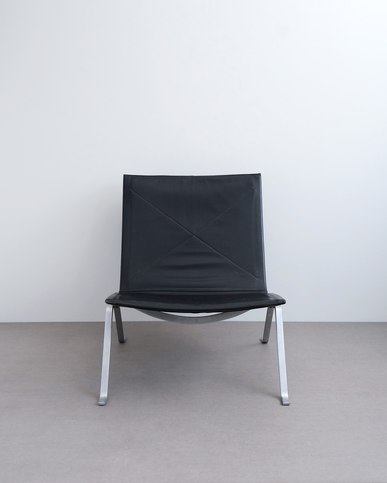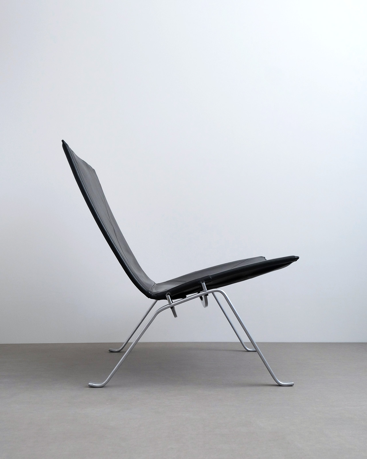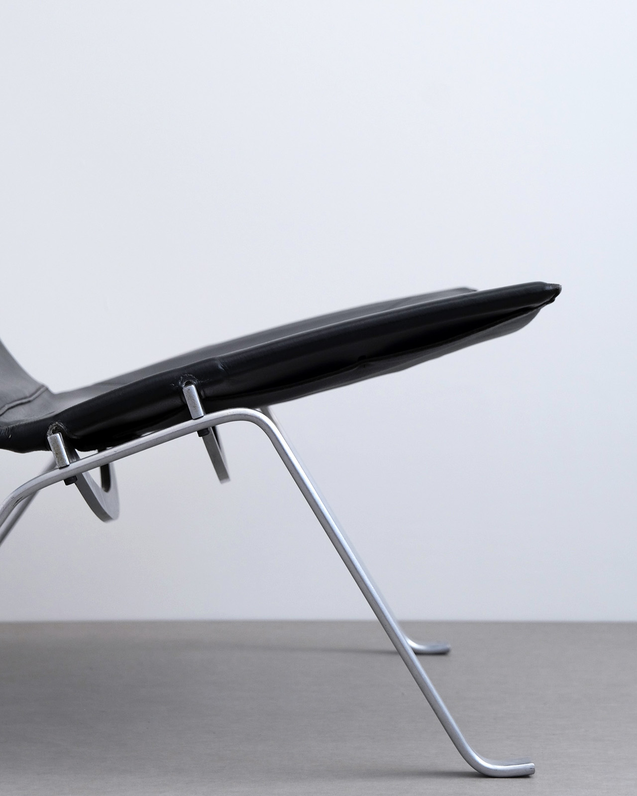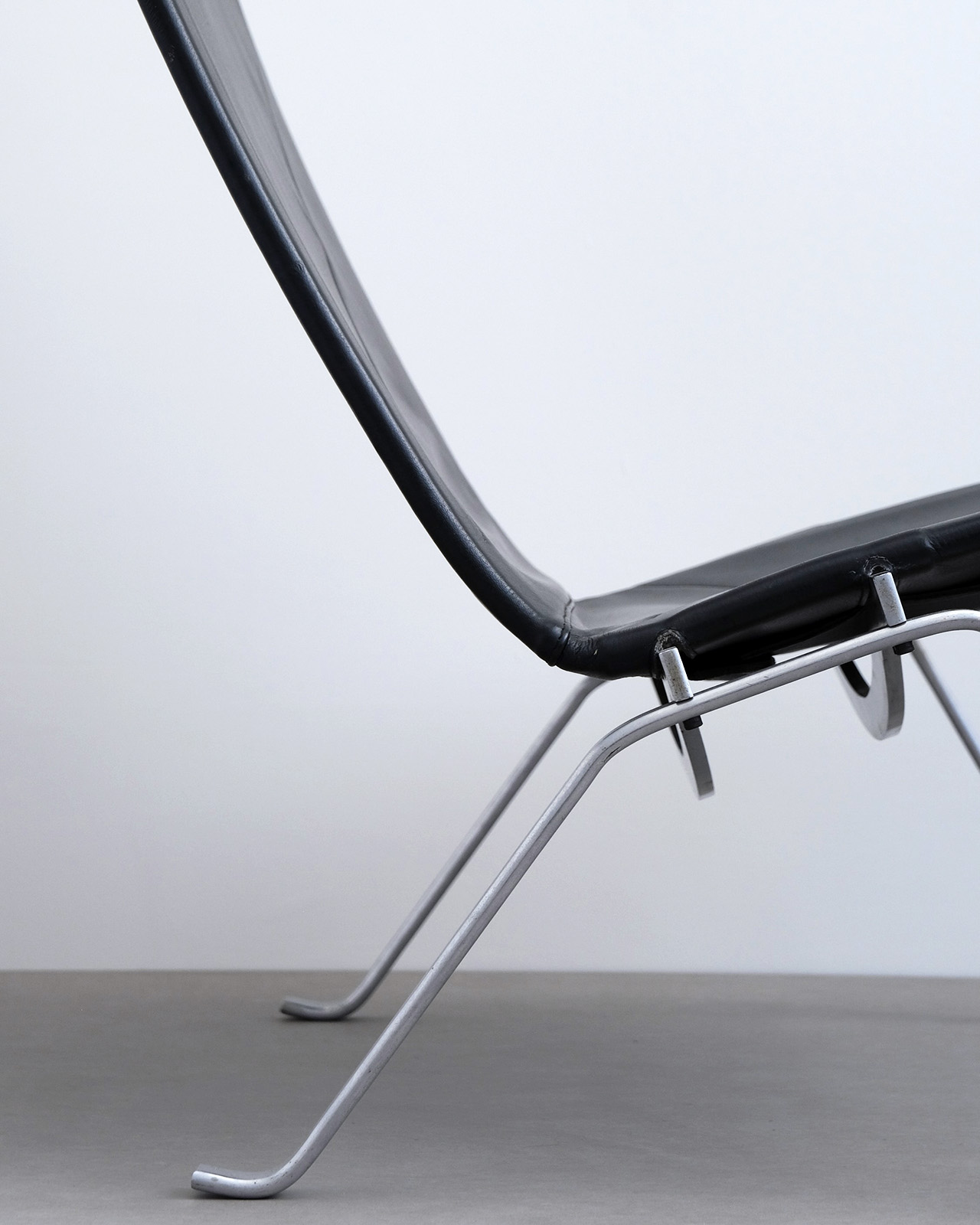 当時デンマークにはなかった十分な強度を持ったスプリングスチールをドイツから取り寄せ、組み立て/分解を可能にしたノックダウン構造を採用することで生産性の高さとミニマルな構成を実現。スチール×レザーのクールなイメージの中に、低く深い座面から背面へ立ち上がる優雅な曲線が温もりを感じさせます。着席時にスチールの部材が身体に当たらない考え抜かれた設計によって、張り地だけで身体を支えているようなリラックス感ある自然な座り心地となっています。