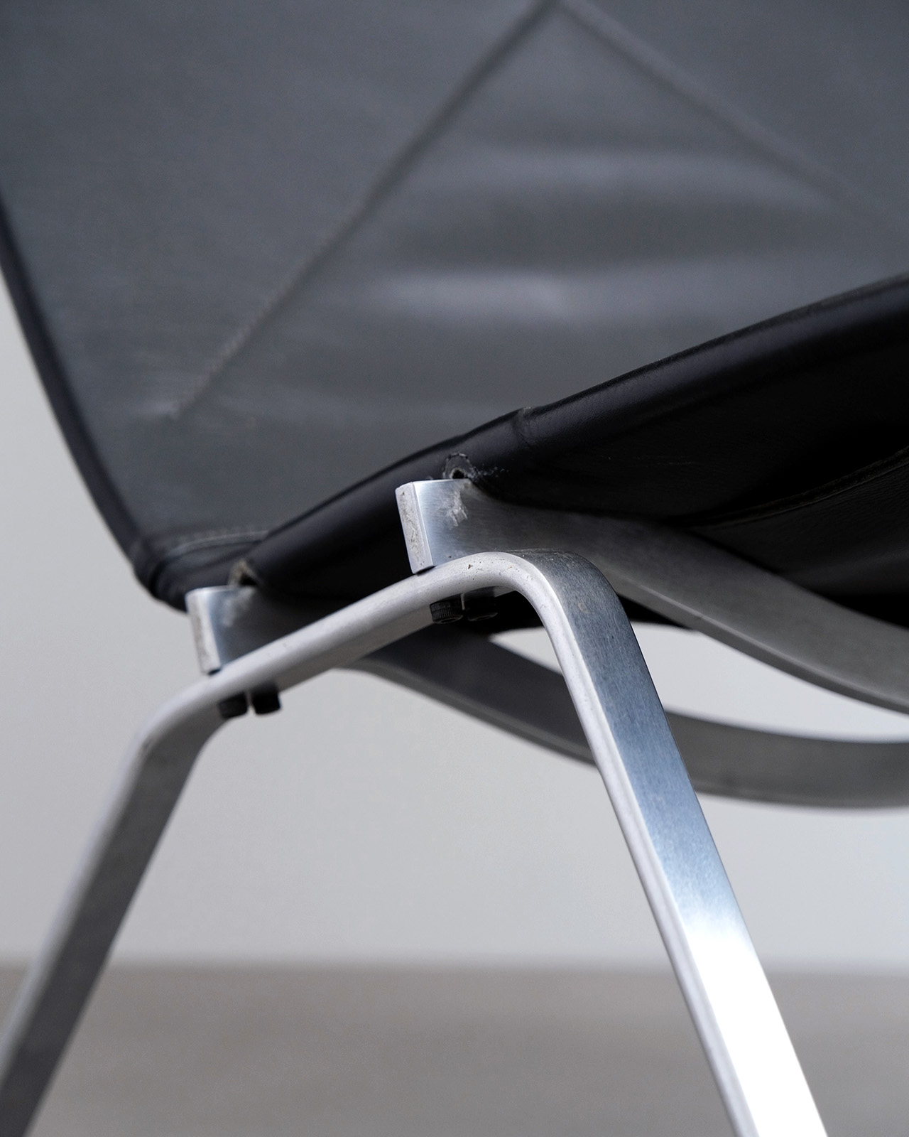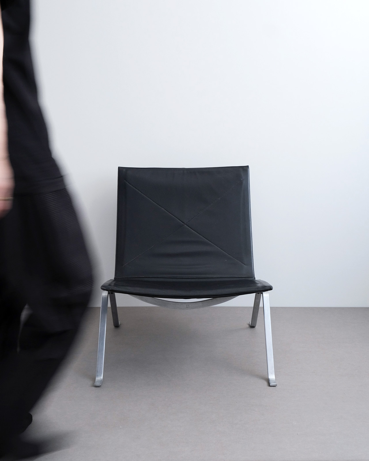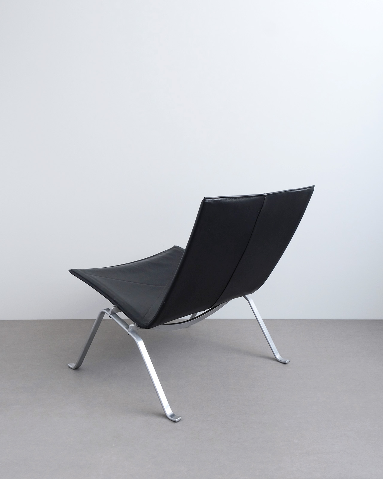 当時デンマークにはなかった十分な強度を持ったスプリングスチールをドイツから取り寄せ、組み立て/分解を可能にしたノックダウン構造を採用することで生産性の高さとミニマルな構成を実現。スチール×レザーのクールなイメージの中に、低く深い座面から背面へ立ち上がる優雅な曲線が温もりを感じさせます。着席時にスチールの部材が身体に当たらない考え抜かれた設計によって、張り地だけで身体を支えているようなリラックス感ある自然な座り心地となっています。