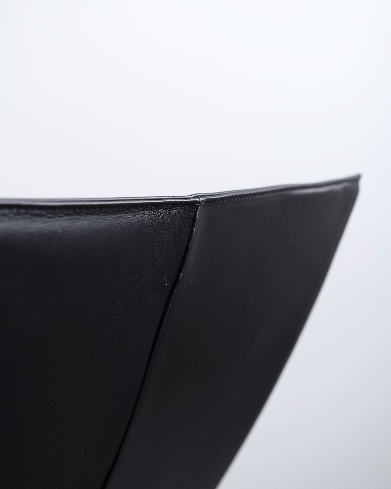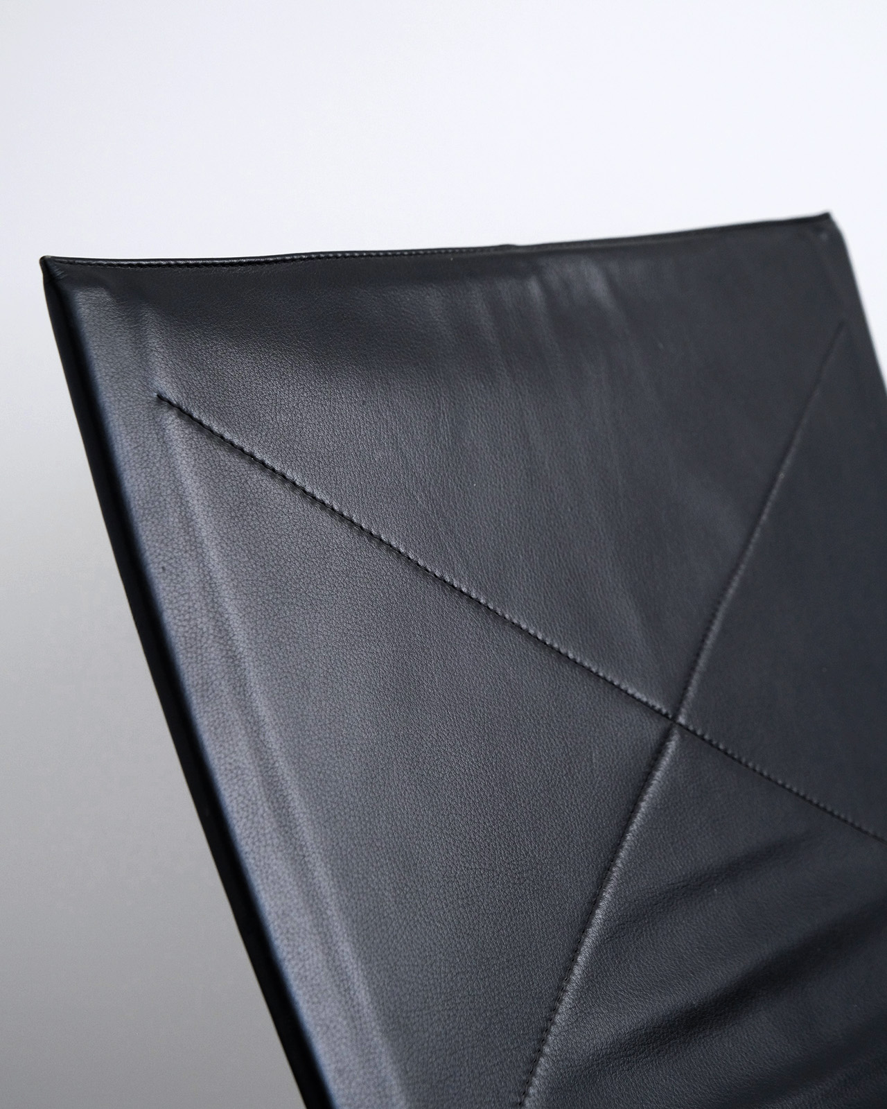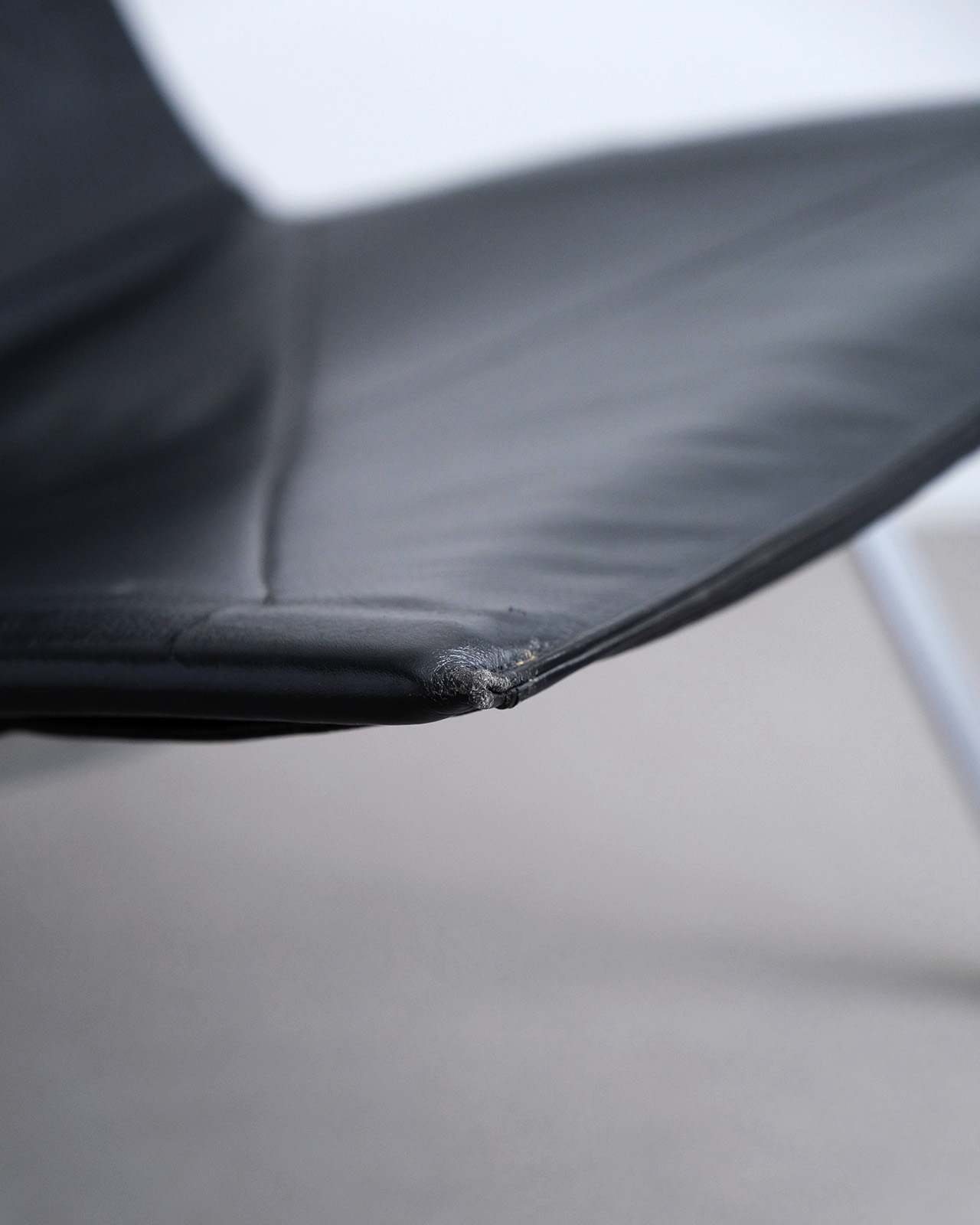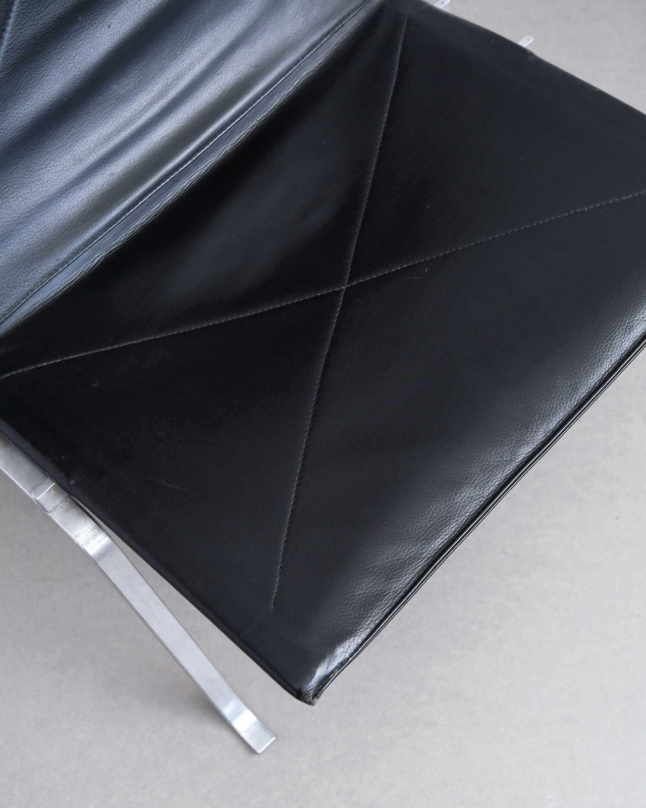 当時デンマークにはなかった十分な強度を持ったスプリングスチールをドイツから取り寄せ、組み立て/分解を可能にしたノックダウン構造を採用することで生産性の高さとミニマルな構成を実現。スチール×レザーのクールなイメージの中に、低く深い座面から背面へ立ち上がる優雅な曲線が温もりを感じさせます。着席時にスチールの部材が身体に当たらない考え抜かれた設計によって、張り地だけで身体を支えているようなリラックス感ある自然な座り心地となっています。