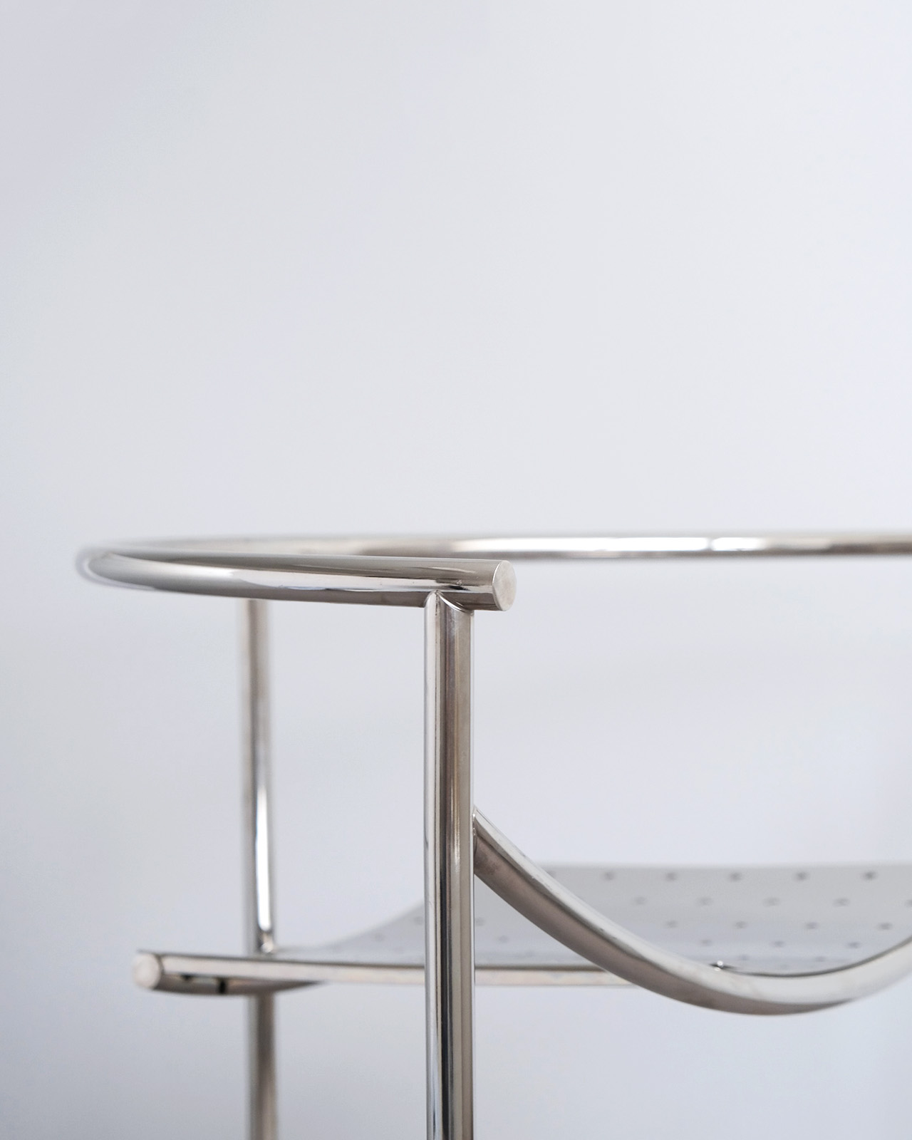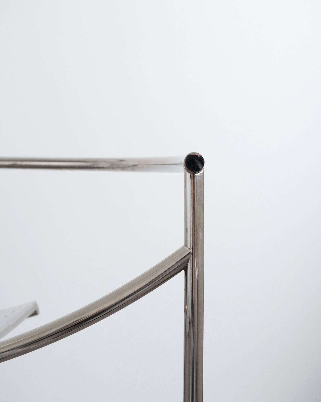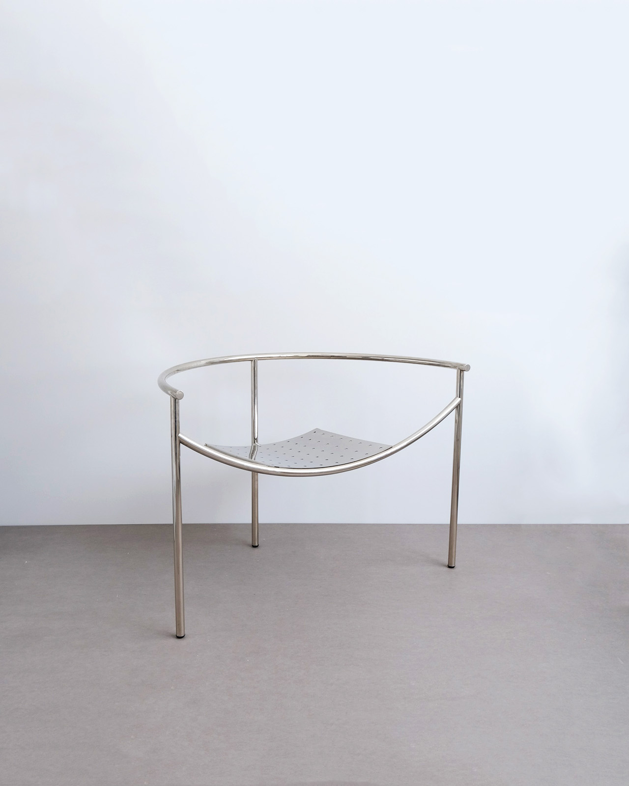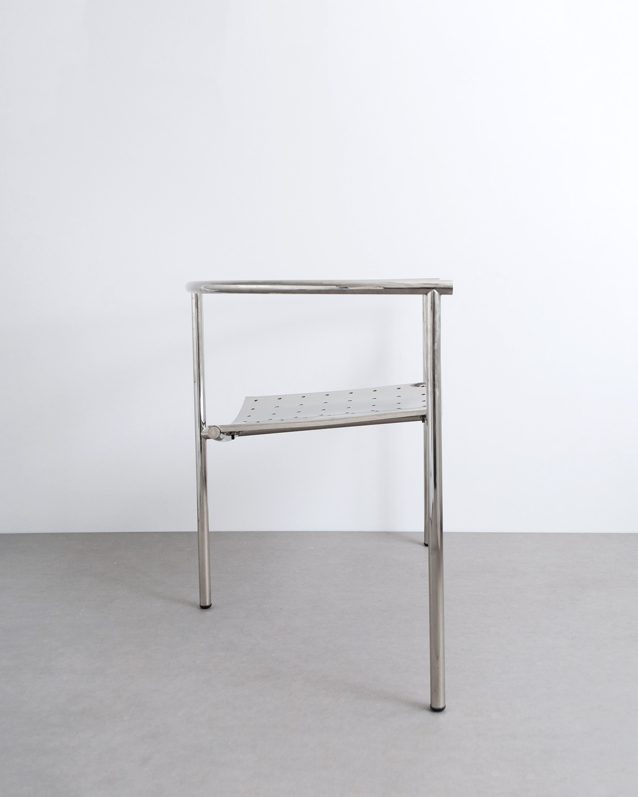 垂直に立つ3本脚と弧を描くスチールチューブフレームに、パンチングメタルの座面のみというミニマルな構成。ひと目でそれとわかるオリジナリティあるフォルムに、スチールチューブとパンチングメタルの精巧な接合部がひときわ際立ちます。抜けのある軽やかさを持ちながら、空間を一変させる存在感を持ったデザインの力を感じせる一脚です。
