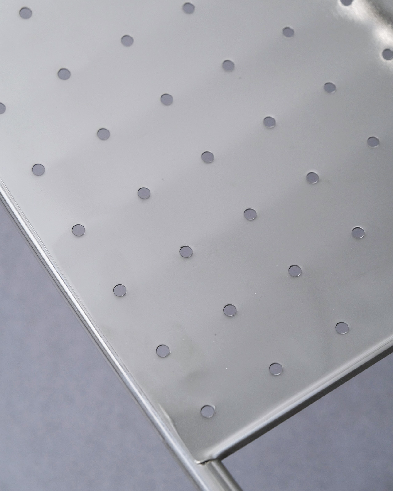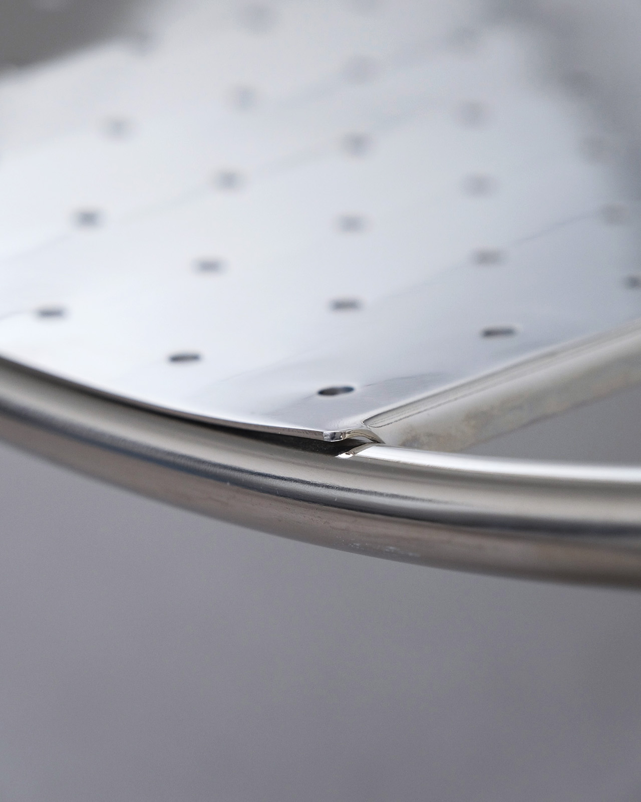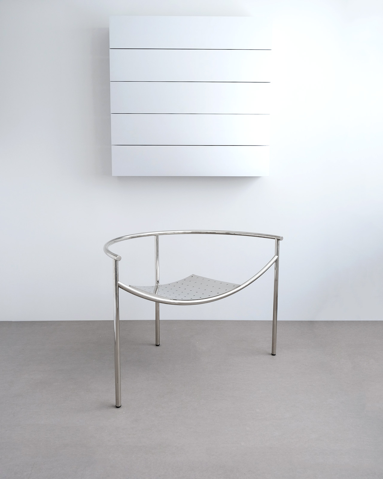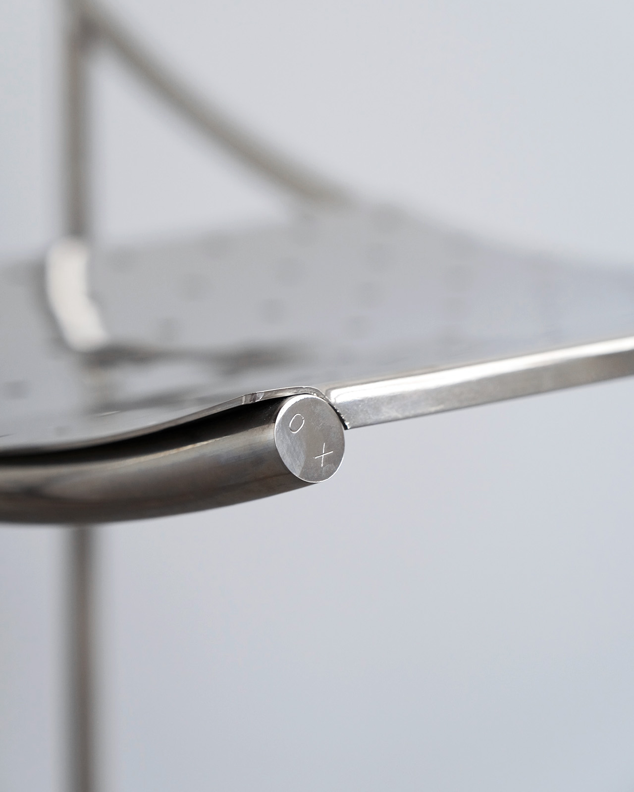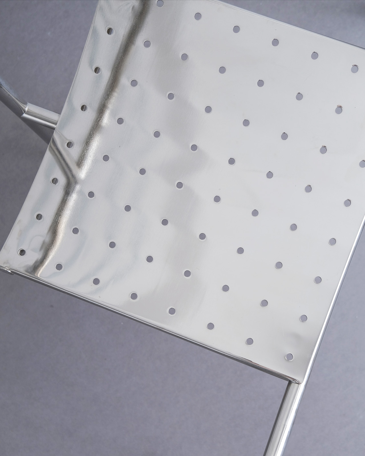 垂直に立つ3本脚と弧を描くスチールチューブフレームに、パンチングメタルの座面のみというミニマルな構成。ひと目でそれとわかるオリジナリティあるフォルムに、スチールチューブとパンチングメタルの精巧な接合部がひときわ際立ちます。抜けのある軽やかさを持ちながら、空間を一変させる存在感を持ったデザインの力を感じせる一脚です。