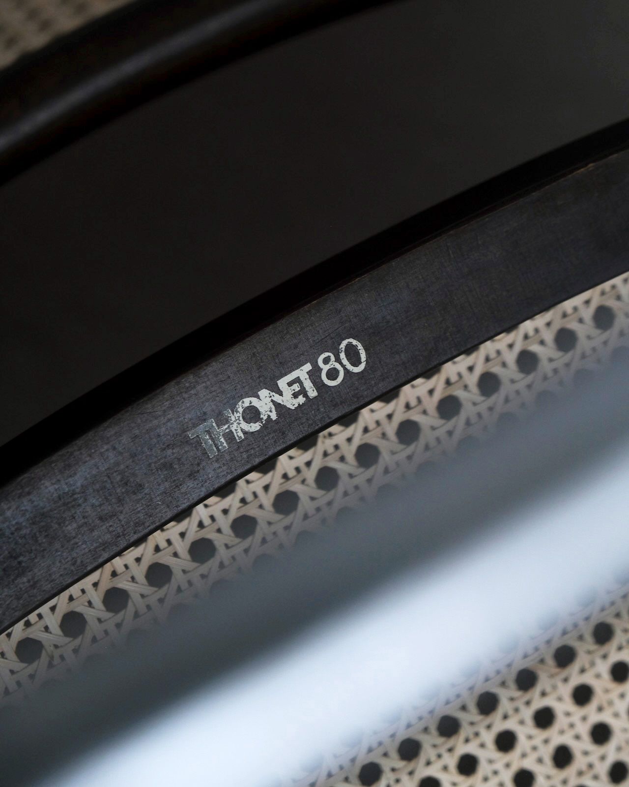 ウッド部分はダークブラウン。座面裏木部にThonetの製造記号スタンプ入り。