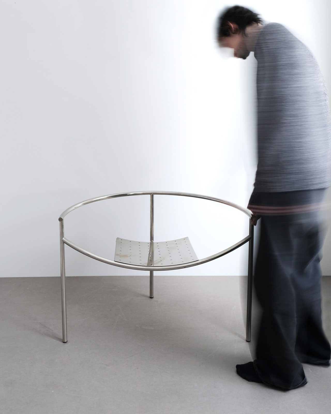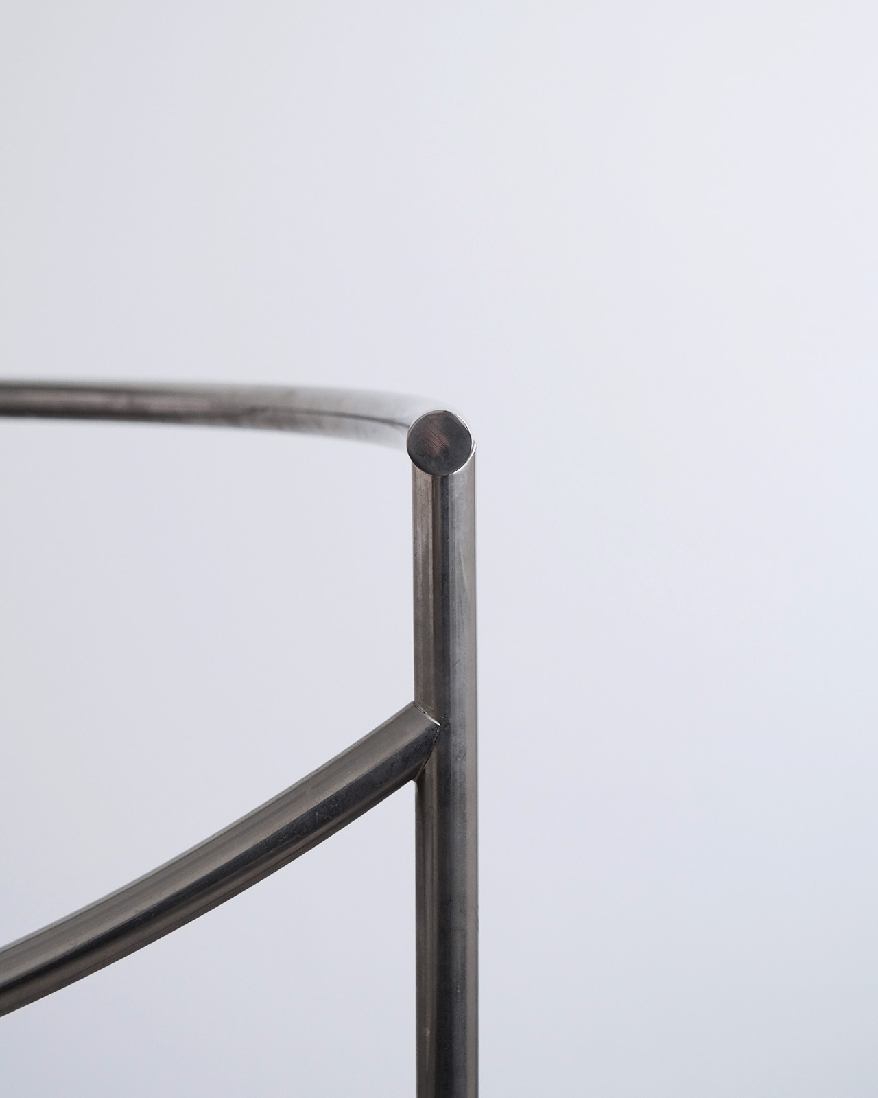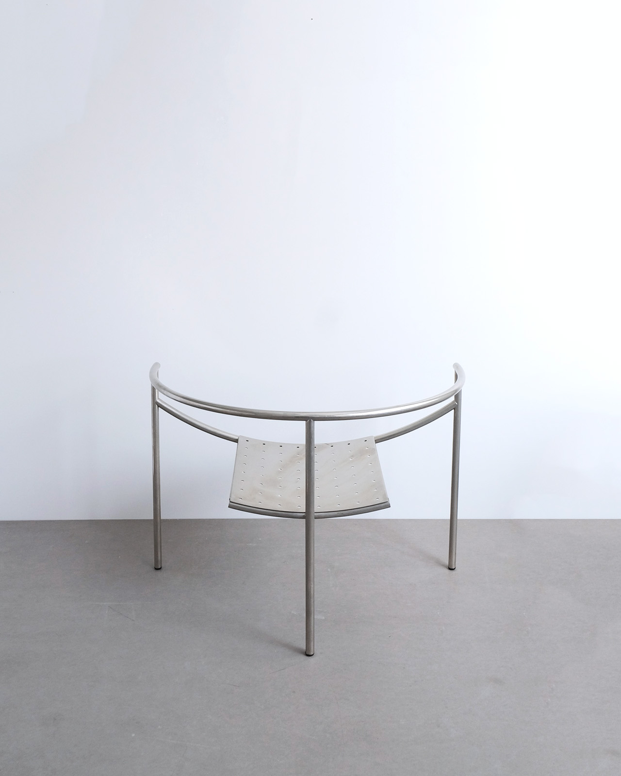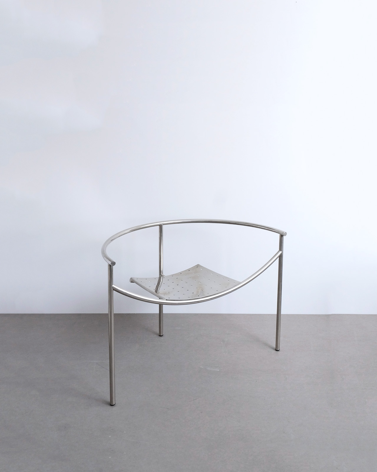 垂直に立つ3本脚と弧を描くスチールチューブフレームに、パンチングメタルの座面のみというミニマルな構成。ひと目でそれとわかるオリジナリティあるフォルムに、スチールチューブとパンチングメタルの精巧な接合部がひときわ際立ちます。抜けのある軽やかさを持ちながら、空間を一変させる存在感を持ったデザインの力を感じせる一脚です。