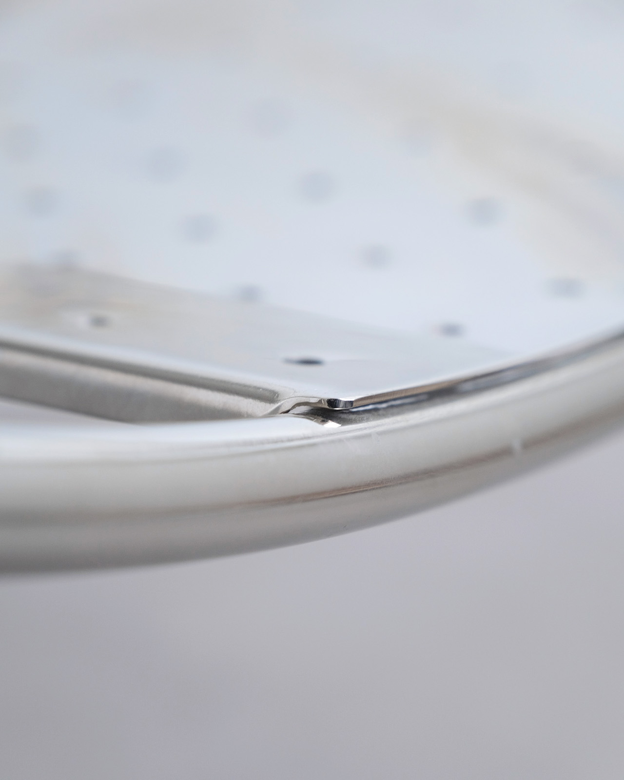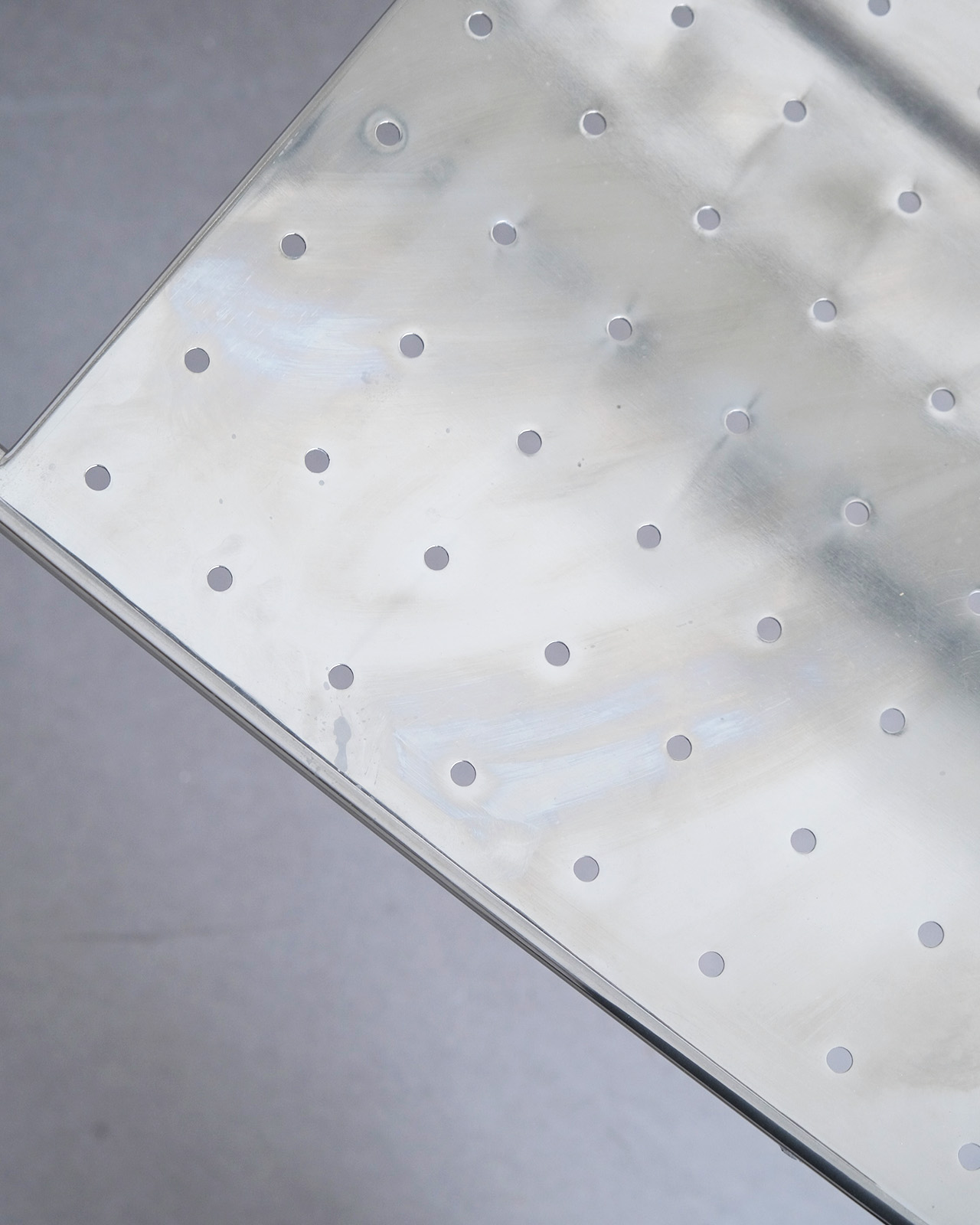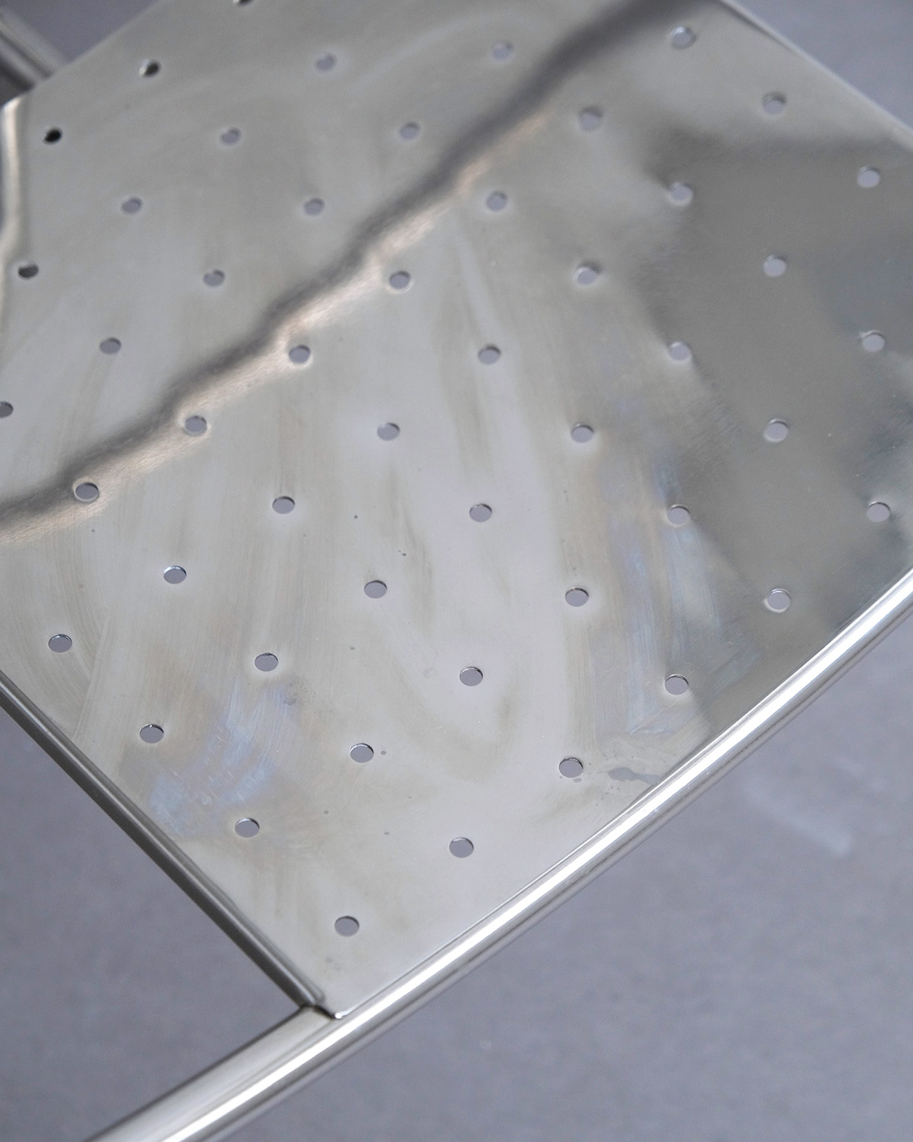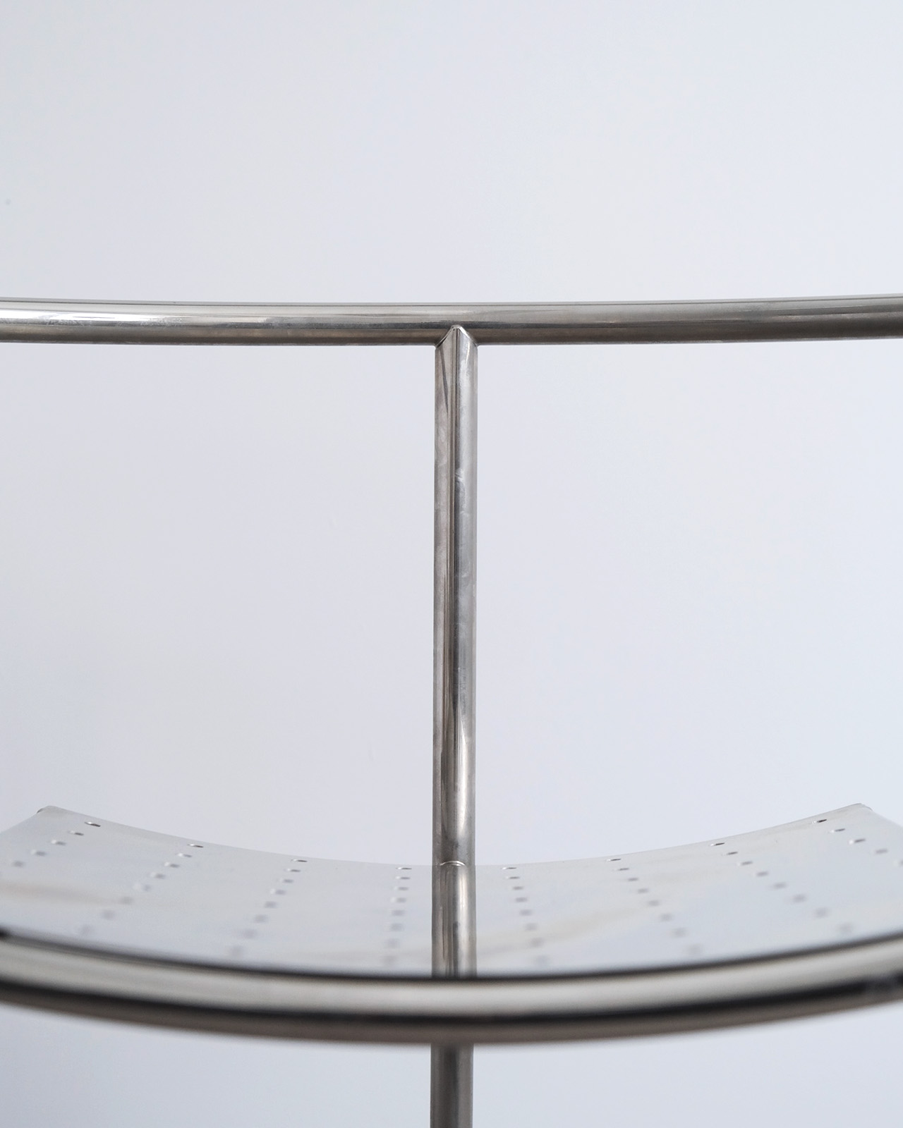 垂直に立つ3本脚と弧を描くスチールチューブフレームに、パンチングメタルの座面のみというミニマルな構成。ひと目でそれとわかるオリジナリティあるフォルムに、スチールチューブとパンチングメタルの精巧な接合部がひときわ際立ちます。抜けのある軽やかさを持ちながら、空間を一変させる存在感を持ったデザインの力を感じせる一脚です。